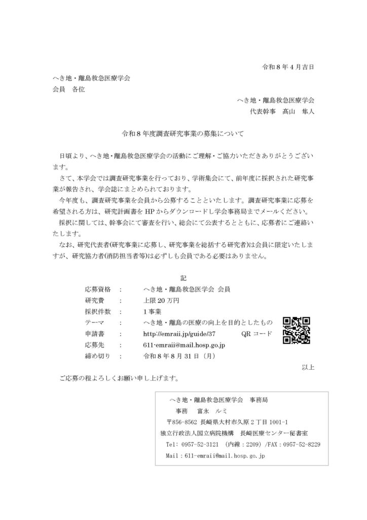 令和8年度 調査研究事業の応募を開始いたします 投稿日: 2026年4月16日 投稿者: emraii@ml.nagasaki-u.ac.jp 今年度も、調査研究事業を会員から公募することといたします。調査研究事業に応募を希望される方は、研究計画書をHPからダウンロードし学会事務局までメールください。 調査研究事業 申請書 https://emraii.jp/guide/37